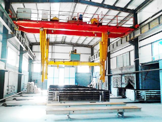 加氣混凝土起重機是專門用來吊運混凝土模具和坯體的專用起重機,由箱形橋架、大車運行機構(gòu)、起升機構(gòu)及電氣設(shè)備四部分組成,配合專用吊具,完成模具的翻轉(zhuǎn)、開模和脫模等工作。